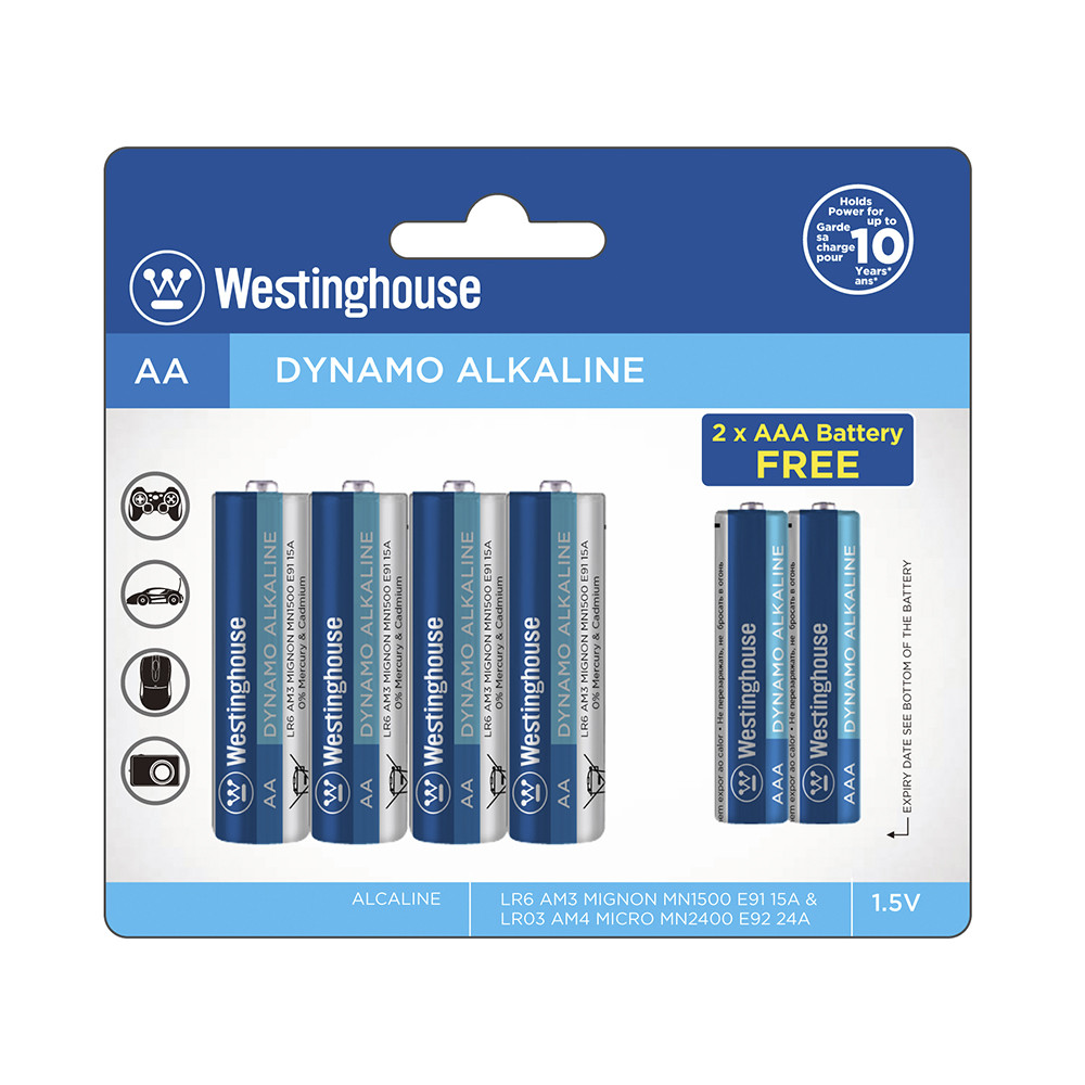 Лужні батарейки Westinghouse Dynamo Alkaline АА/LR6 (пальчикові) та ААА/LR03 (мініпальчикові) однієї з провідних електротехнічних компаній США найкраще підходять для приладів із постійним середнім або високим енергоспоживанням: іграшки, комп'ютерна миша, настінний годинник тощо, забезпечуючи довгу та безперебійну роботу.
